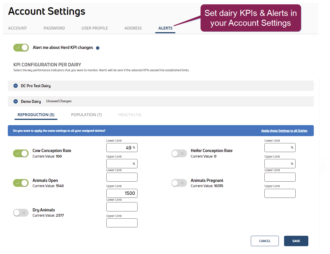 - If you have access to more than one PULSE dairy, you can either set unique thresholds for each dairy or set the same values for all dairies.