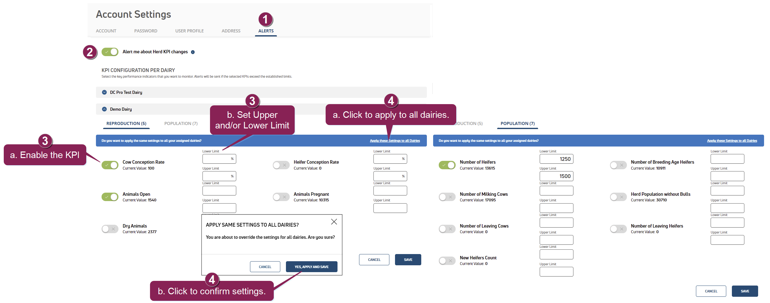 - Click the Apply these Settings to all Dairies option to apply the settings across all dairies.