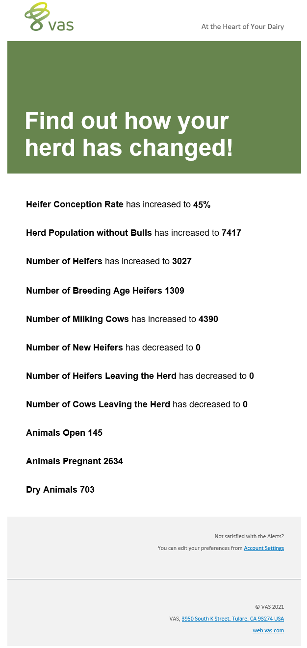 You will receive up to one Alert email per day for each dairy with Reproduction and Population Alerts enabled in your Account Settings. PULSE evaluates your herd data against your Reproduction and Population KPIs after midnight on a daily basis. If any herd attributes fall below a lower limit or exceed an upper limit, an Alert email is sent in the early morning hours to the email address you use to log in to PULSE.