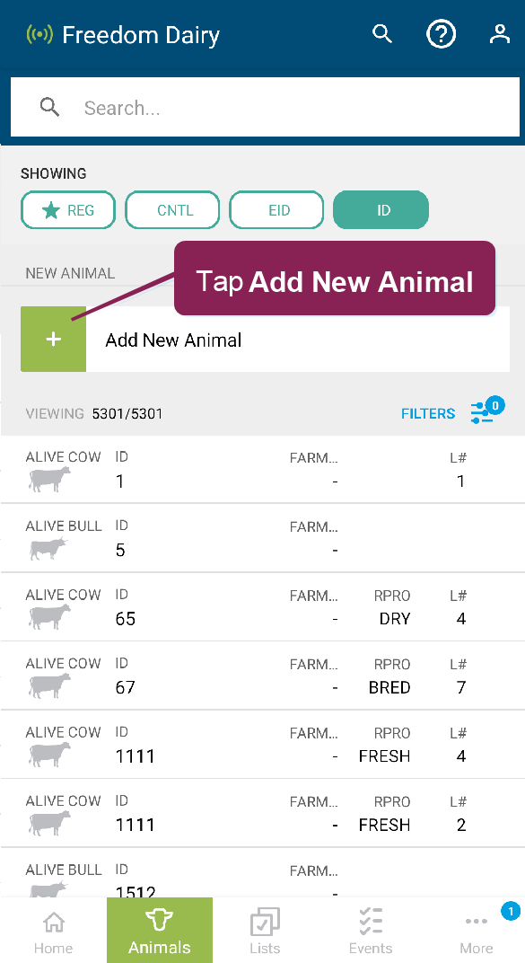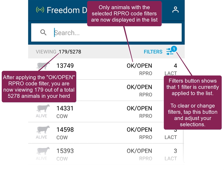The Animals page in the mobile app allows you to view animals in your herd. When you tap the Animals button at the bottom of the mobile app, it opens to a list of all animals in your herd. From there, use the search field at the top to find a specific animal, or use the Filters option to narrow the list by RPROClosed Reproductive code code. Tap on any animal in the list to view its CowCard.