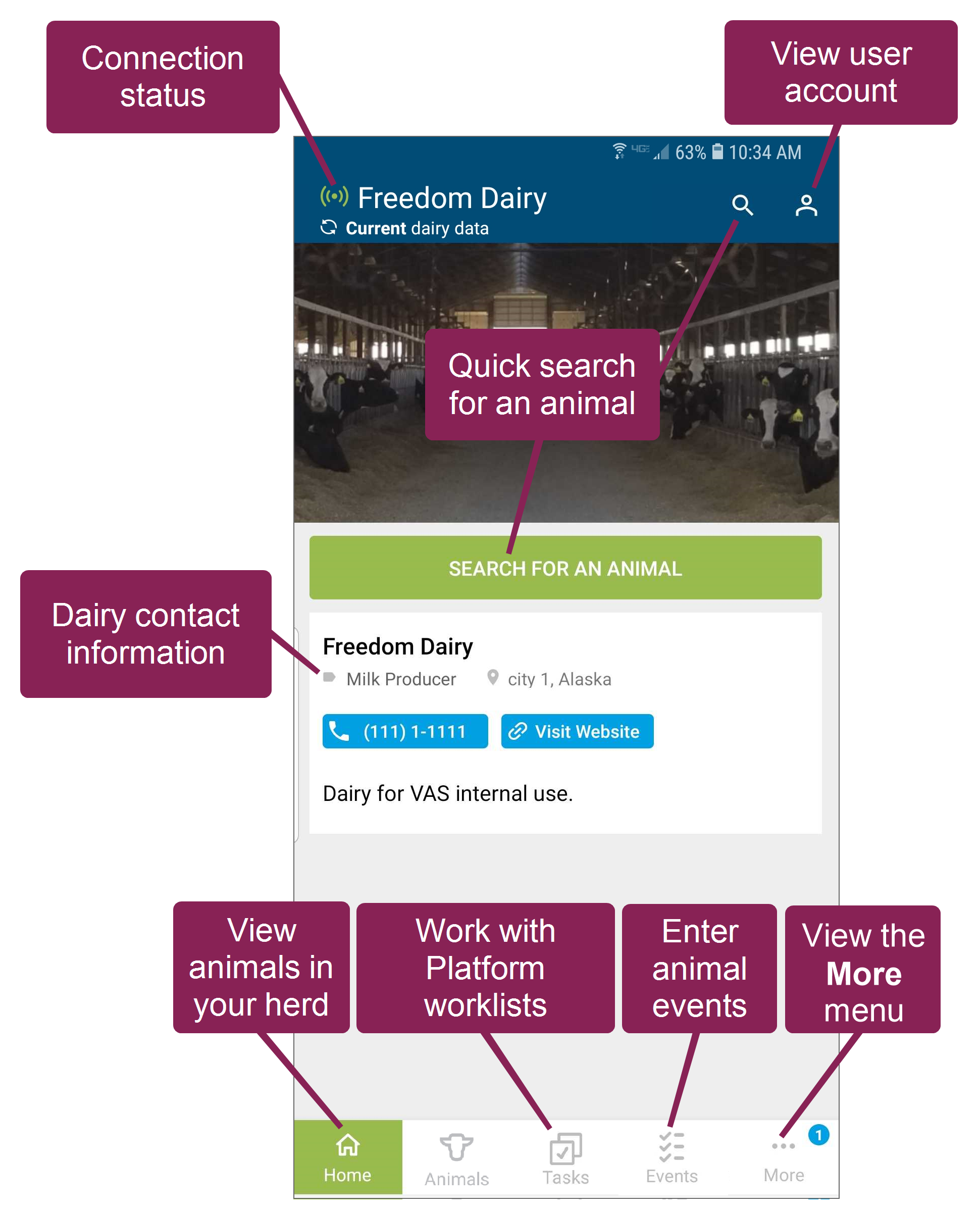 When you launch the VAS PULSE Platform mobile app, it opens to the Home page. See the example below to learn more about your options on the Home page.