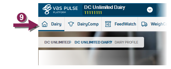 17. Breadcrumbs: The top left of each page shows a breadcrumb path to where you are in PULSE. You can click the dairy name as a shortcut to return to the dairy home page.