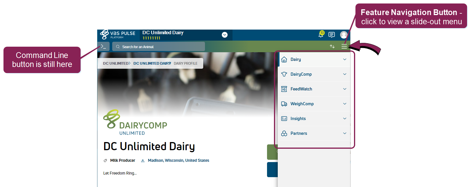 11. DairyComp/MyDC button: Click the DairyComp/MyDC button to view a menu of DairyComp/MyDC features in PULSE, including worklists, reports, and animals. Click here to find the full list of features under this menu option.