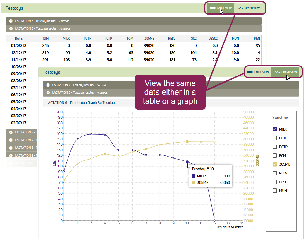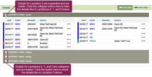 Do you prefer to see all events in one list, or to see more information all on one screen? Would you rather see your data in a chart than a table? Look over to the far right in the title bar on certain screens to switch between dual table or single table view, or switch between table view and graph view.