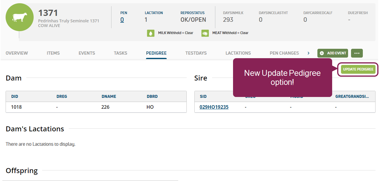 ENHANCEMENT Update sire details from the Pedigree tab on the CowCard! Use the new Update Pedigree button to update an animal's maternal grandsire and great grandsire from the CowCard Pedigree tab. This enhancement makes it easy to keep your herd's genetic data accurate! See Update Pedigree to learn more.