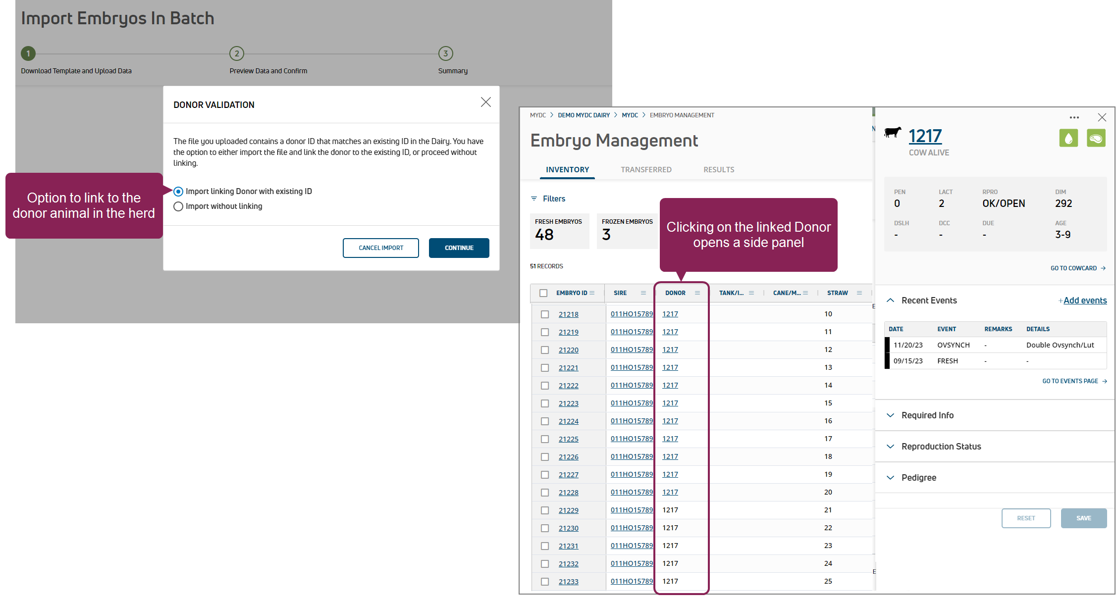 - If the donor for the embryo is in the herd, you have the option to link to the donor animal for quick and convenient access! After the embryo is imported, click the Donor link to view the animal's details in a side panel without having to leave the Embryo Management page.