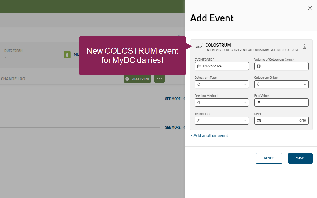 NEW FEATURE MyDC ONLY New COLOSTRUM event. MyDC customers spoke and VAS listened! Making sure newborn calves receive a high-quality colostrum