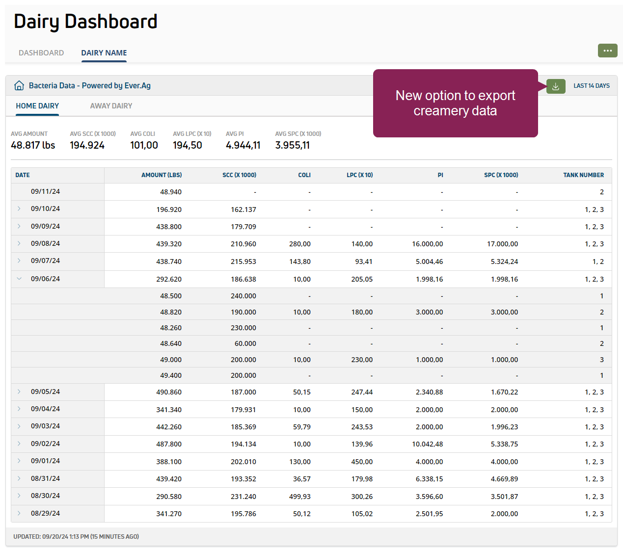 ENHANCEMENT Export data for your creamery integrations! PULSE now offers the option to export your creamery quality and bacteria data to a CSV file for further analysis or other uses. View Dashboards to access your creamery widgets and use the new export button to save your data. It's that easy!