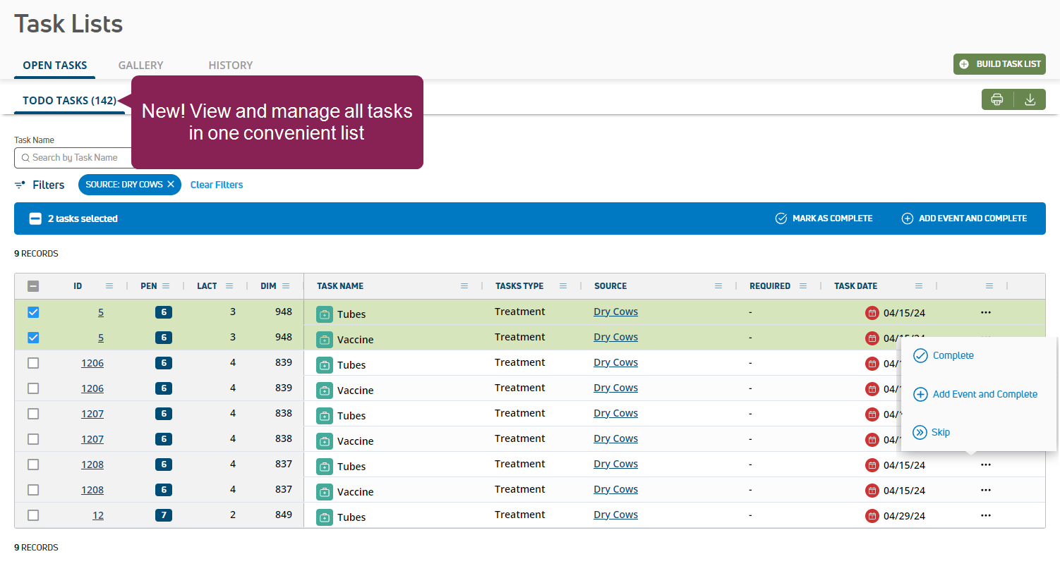 NEW FEATURE MyDC ONLY Task Lists are now available! MyDC dairies can now see and manage all daily animal activities on one convenient list! Use Task Lists to consolidate all required animal activities for the current day, including all OvSynch protocols, vet checks, and any other scheduled tasks. Use Task Builder to generate a custom task list, or choose one of your saved lists from the Task Lists Gallery.