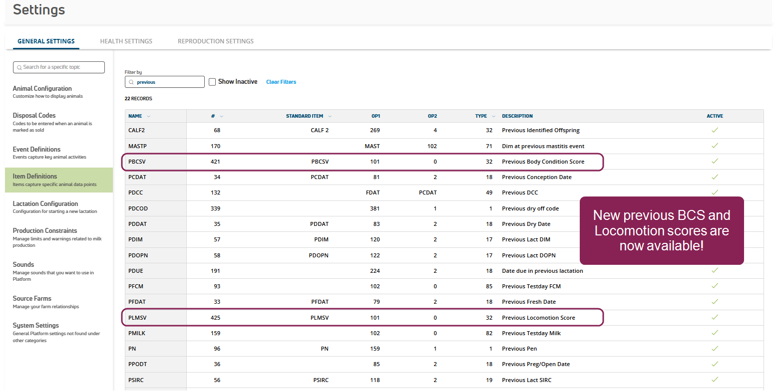 ENHANCEMENT Additional health monitoring data available for CattleEye and HerdVision integrations! PULSE and DairyComp now support multiple BCS and locomotion score values for data analysis and reporting purposes. Use the new previous scores to compare them to the last recorded values. See CattleEye Items or HerdVision Items to learn more about all available items!