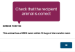 • If an animal was BRED within 10 days, TRANSFER events cannot be added and PULSE flags the animal in an error message: