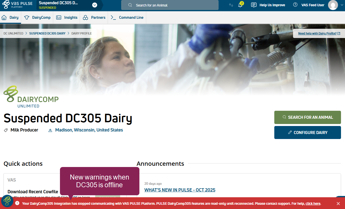 ENHANCEMENT DC Unlimited ONLY Protect your herd data with PULSE offline mode alerts! If your DC305Closed DairyComp 305 - VAS Dairy Management Software connection goes down, PULSE now warns you and specifies the actions you need to take. This ensures you don't inadvertently edit outdated animal records and keeps your PULSE data current. PULSE detects three different offline modes to safeguard your herd data. See Offline DC305 Integration to learn how to address warnings and make sure your latest animal records are live in PULSE and the mobile app.