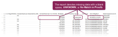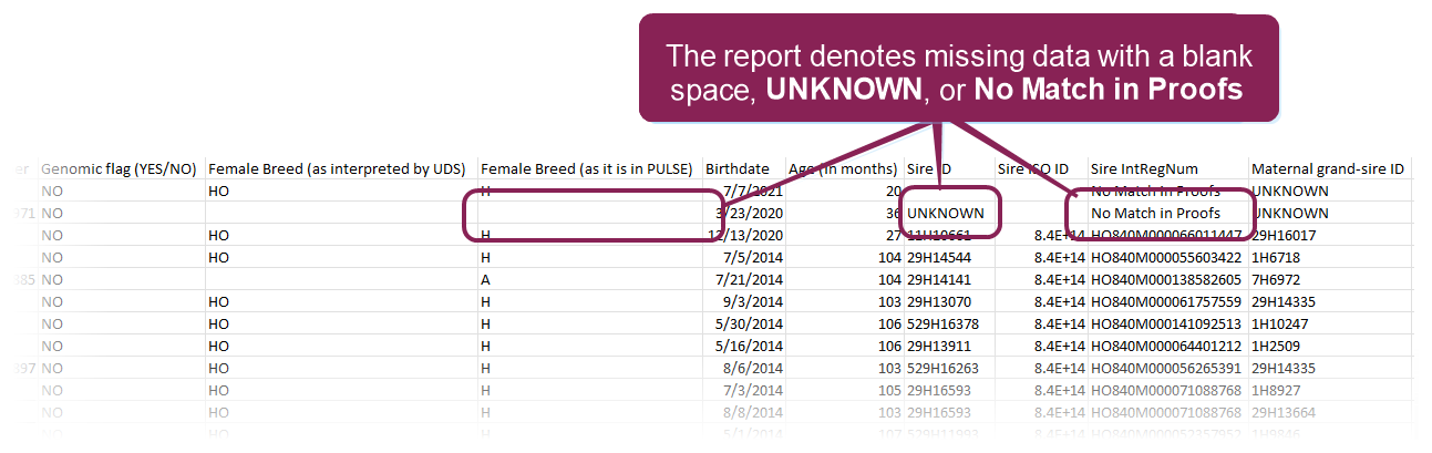 The report denotes missing animal information with one of the following values: a blank space, No Match in Proofs, or UNKNOWN.