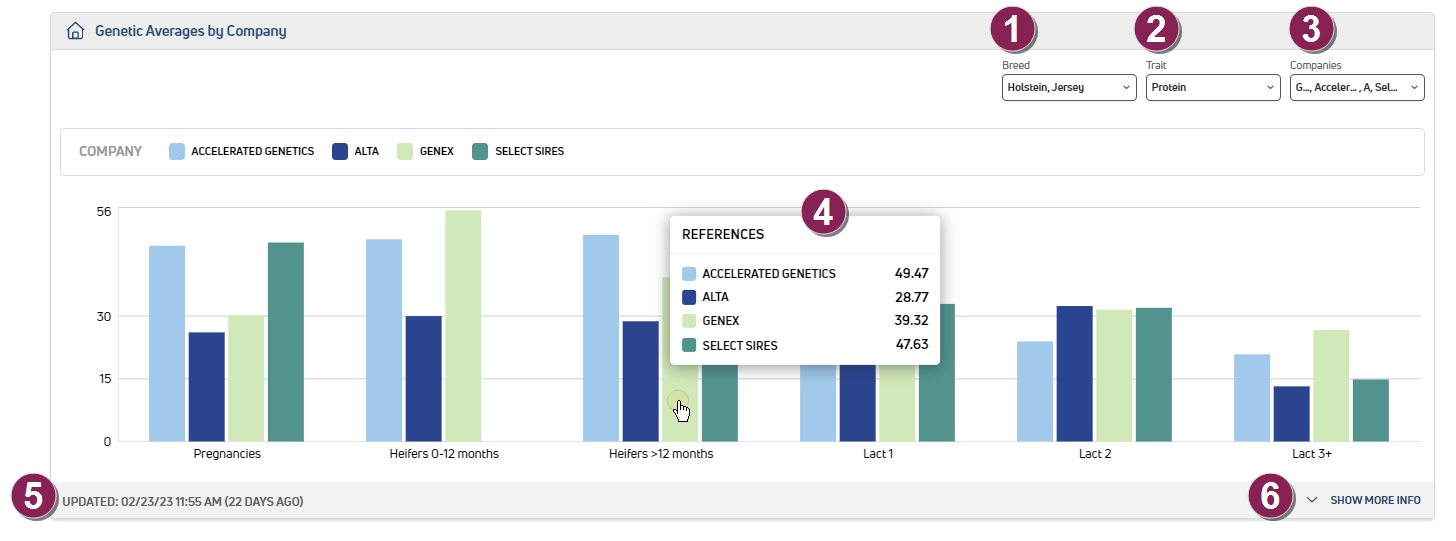 - Select the Companies you want to compare. Based on your settings, the bar graph compares the trait across all suppliers for six standard animals groups.