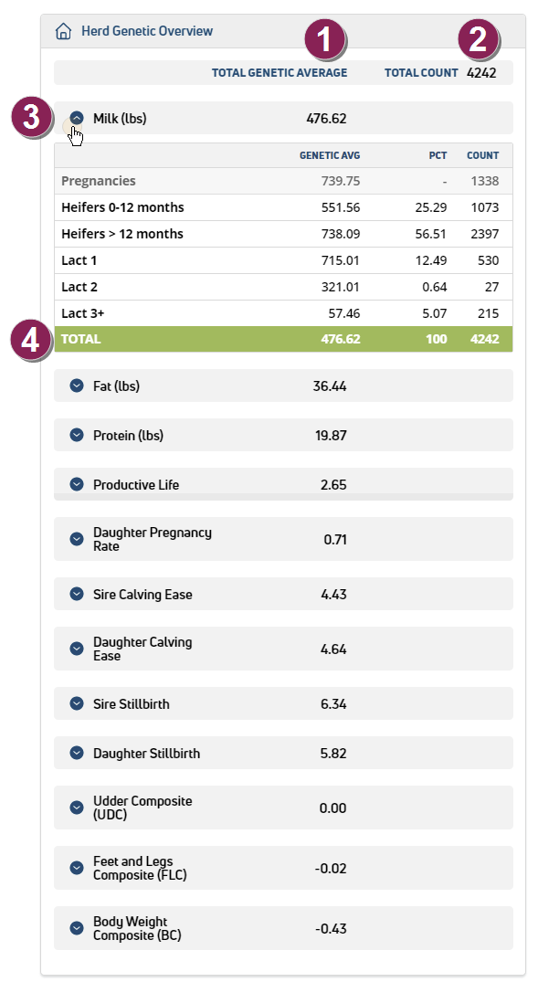 - Genetic average for the trait. This value is based on each animal's genomic trait value, if available, or the trait value calculated based on the animal's sire, dam, maternal grandsire, and maternal great-grandsire.