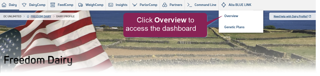 The Alta BLUE LINK Genetic Dashboard includes a variety of widgets that provide overview and genetic assessment details to help you analyze the genetic makeup of the herd. Click Alta BLUE LINK > Overview from the main menu bar to access the dashboard.