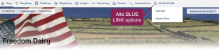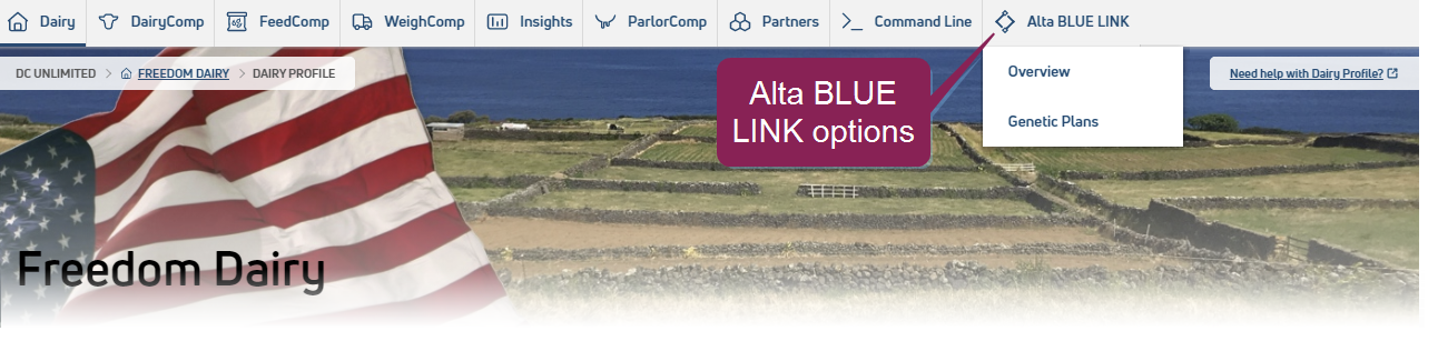 You can find the Alta BLUE LINK button in the main menu bar after logging into the VAS PULSE Platform and selecting a dairy.