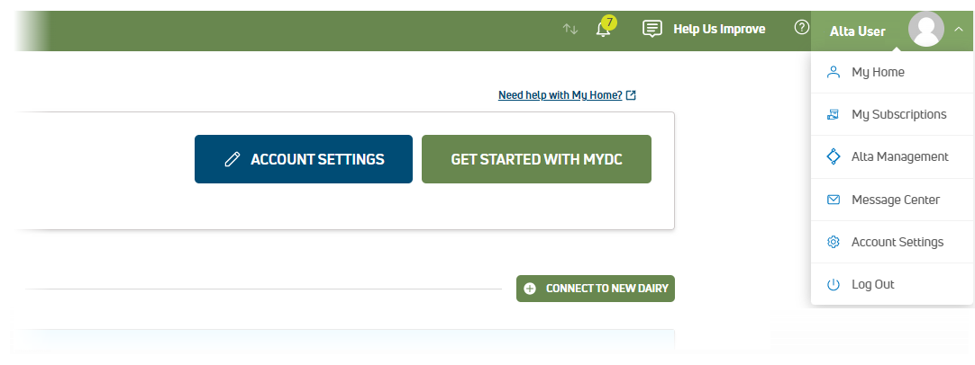 On the Alta Management page, you can view your Dairies and Bull list, as well as edit your dairy's currency, manually add bulls, and more. Access the Alta Management tools for PULSE's genetic planning tool by selecting Alta Management from your user menu at the top right of the page. If you have more permissions, you may see additional tools.