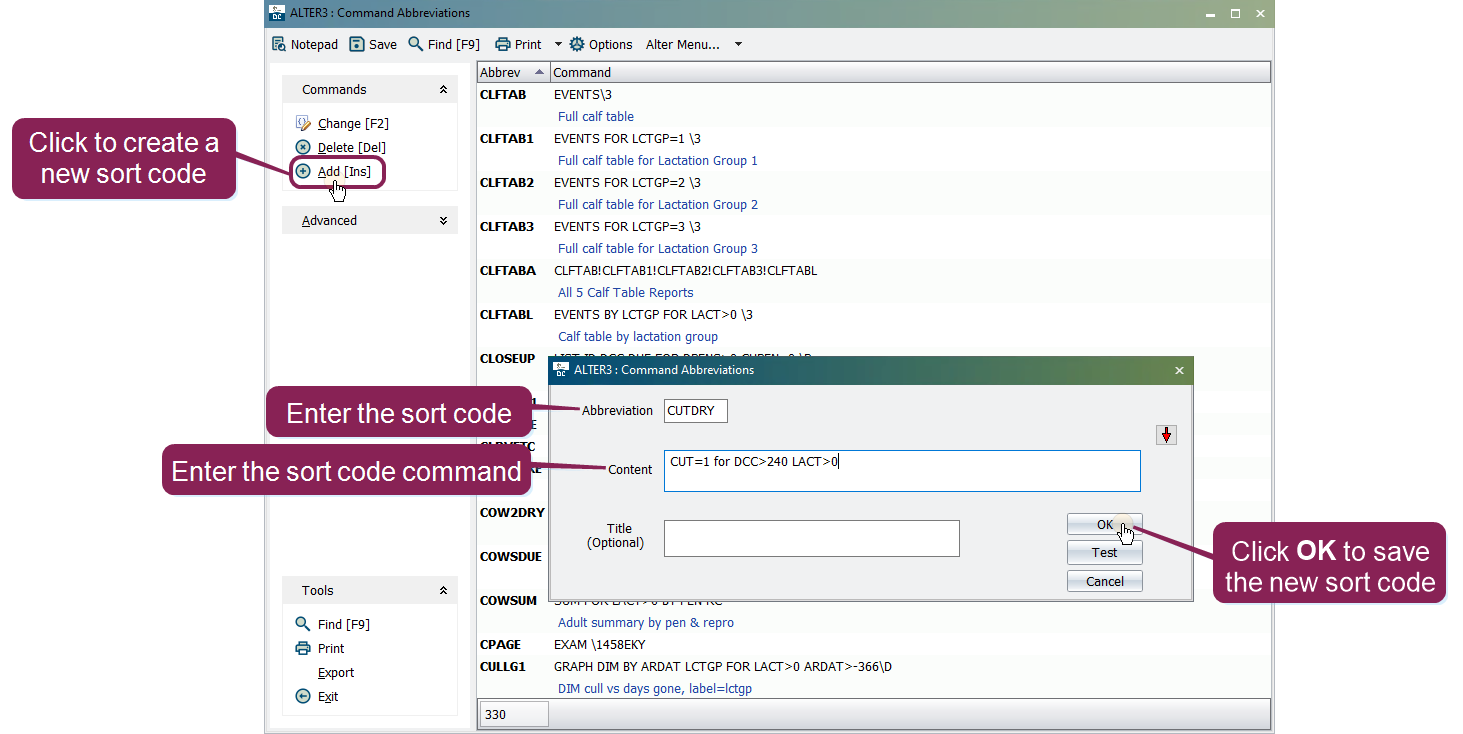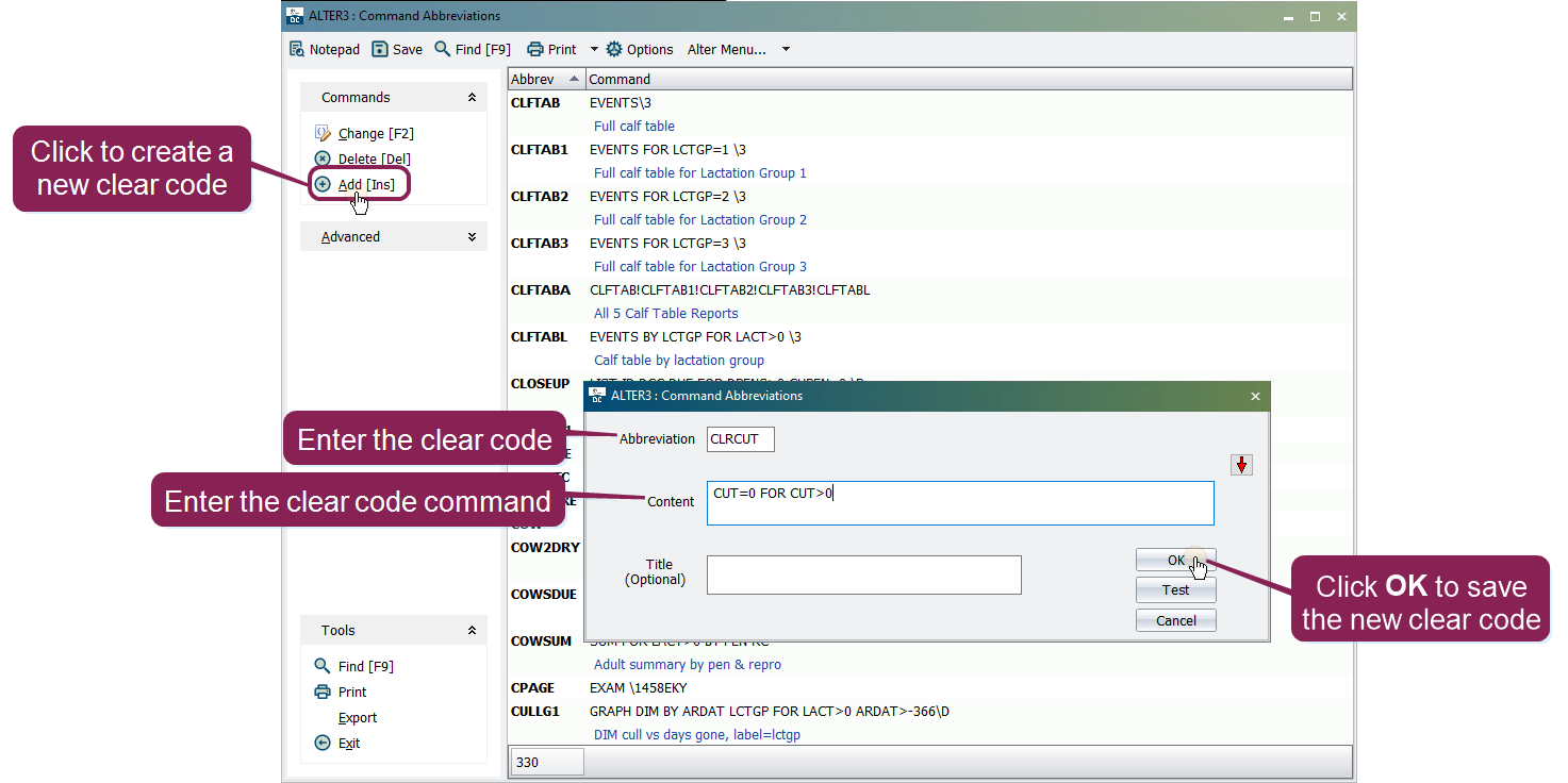 DairyComp 305 - VAS Dairy Management Software, enter ALTER\3 on the command line to open your list of existing commands. - In the upper left corner, click Add [Ins].