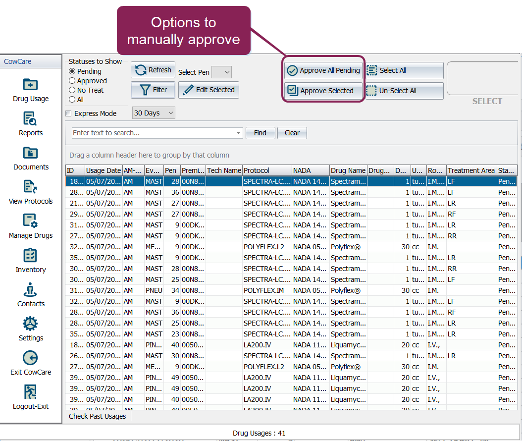 - To approve manually, use the Approve All Pending or Approve Pending options from the Drug Usage tab: