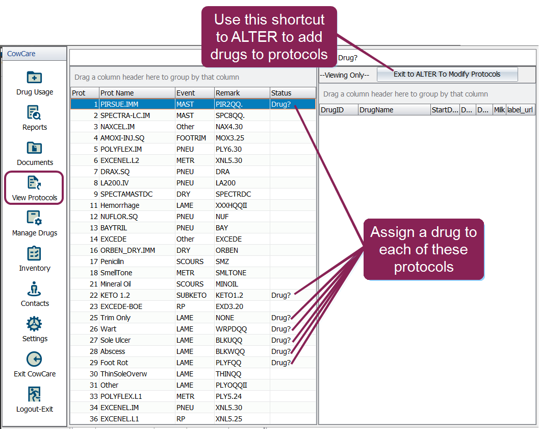 - Use the Exit to ALTER to Modify Protocols shortcut and add drugs to any protocols without drugs. Reference the CowCare User Guide for detailed steps.