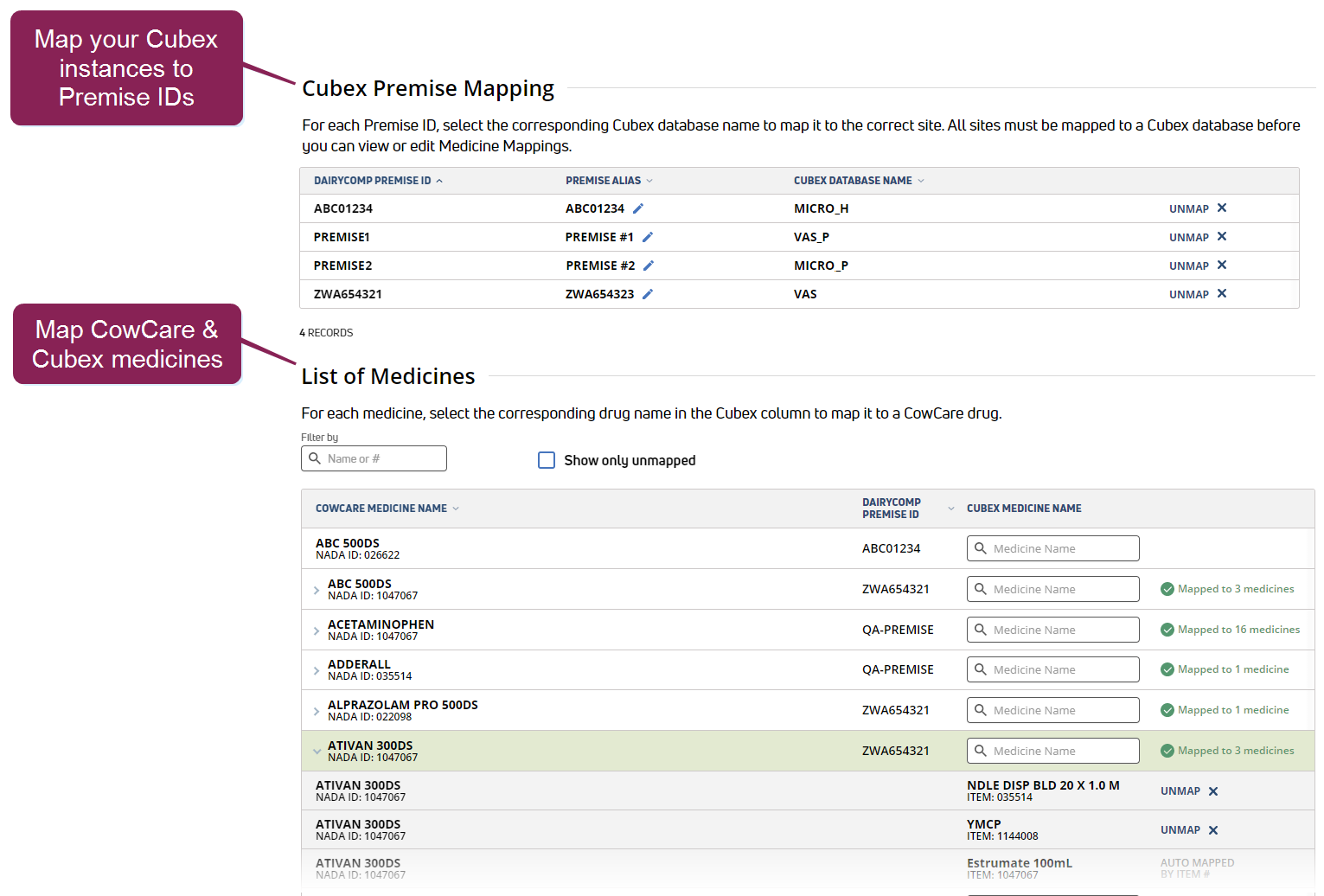 If your dairy installs more than one Cubex instance, you must first map each Premise to a database before you can proceed to mapping medicine names.