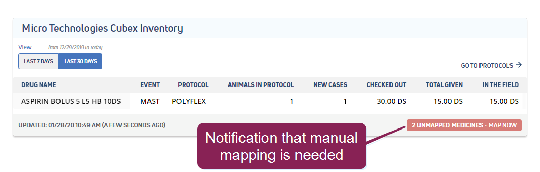 As new medicines are added to CowCare, the Micro Technologies Cubex Inventory widget informs you that additional mappings are needed, and you can return to this Medicine Mapping page to complete them.