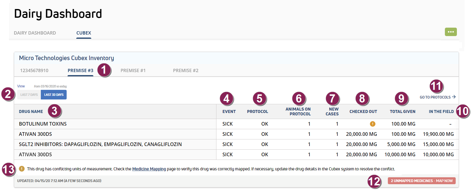 - Unmapped Medicines: If any medicines from the Cubex inventory are not mapped to a CowCare drug, a message displays here to notify you that a mapping is required. Click the link to access the Medicine Mapping page.